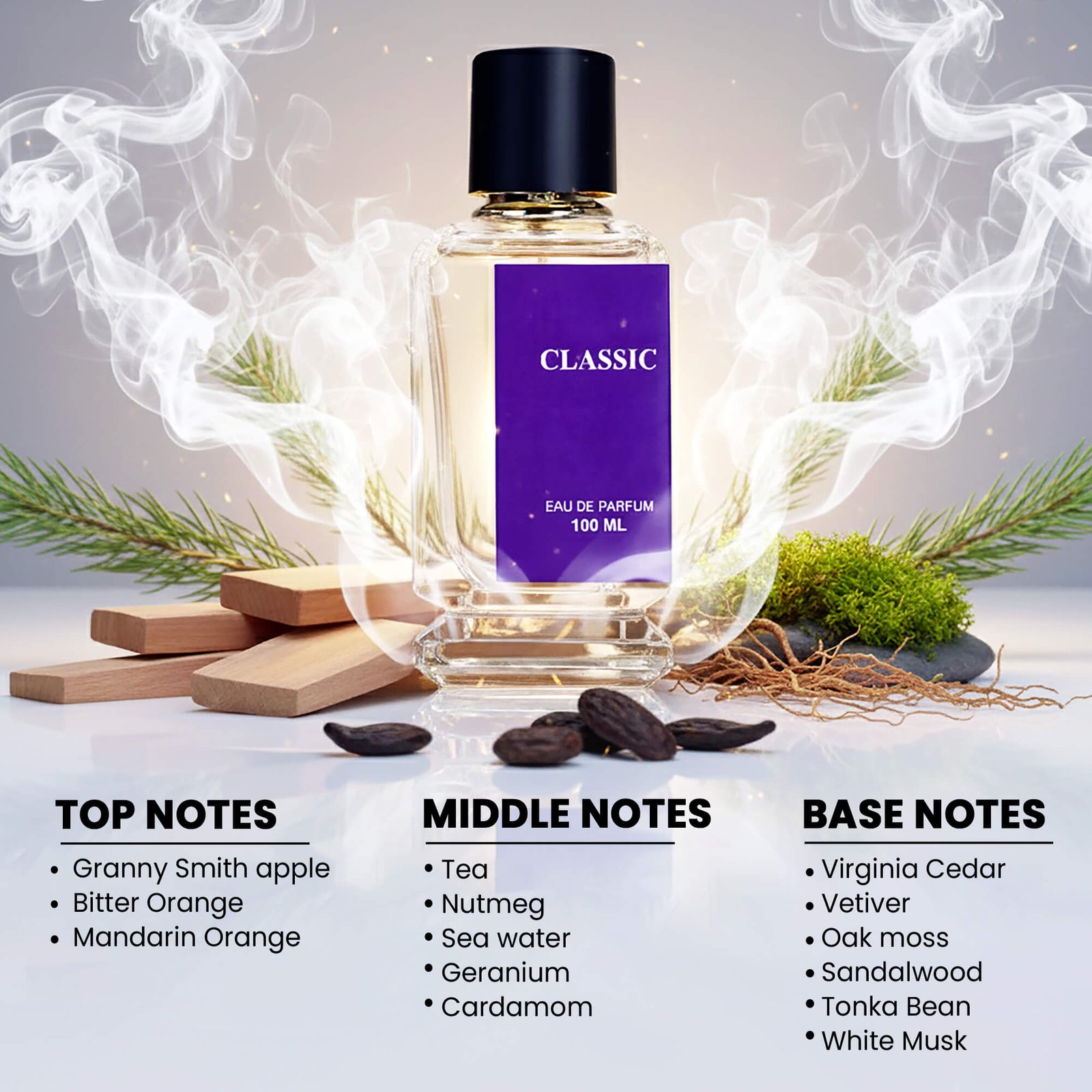 Base Notes—White Musk, Virginia Cedar, Sandalwood, Vetiver, Oak Moss, and Tonka Bean.